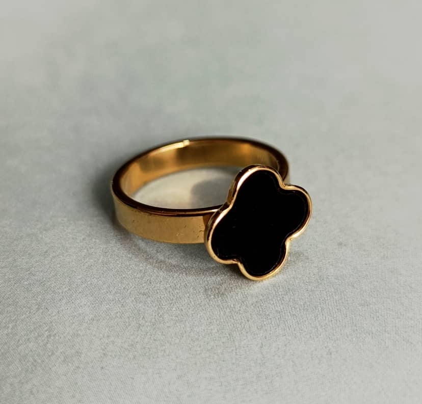انگشتر طلایی رنگ طرح گل مشکی رنگ ثابت