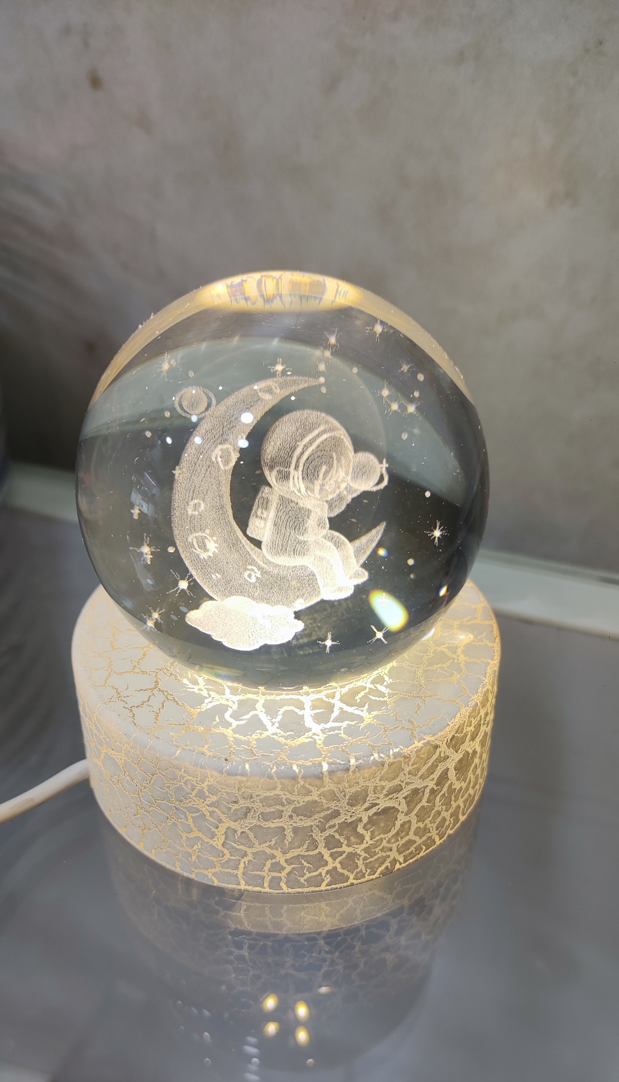 گوی کریستالی سایز ۷ با پایه نورانی و نور Led و کابل Usb طرح فضانورد نشسته روی ماه
