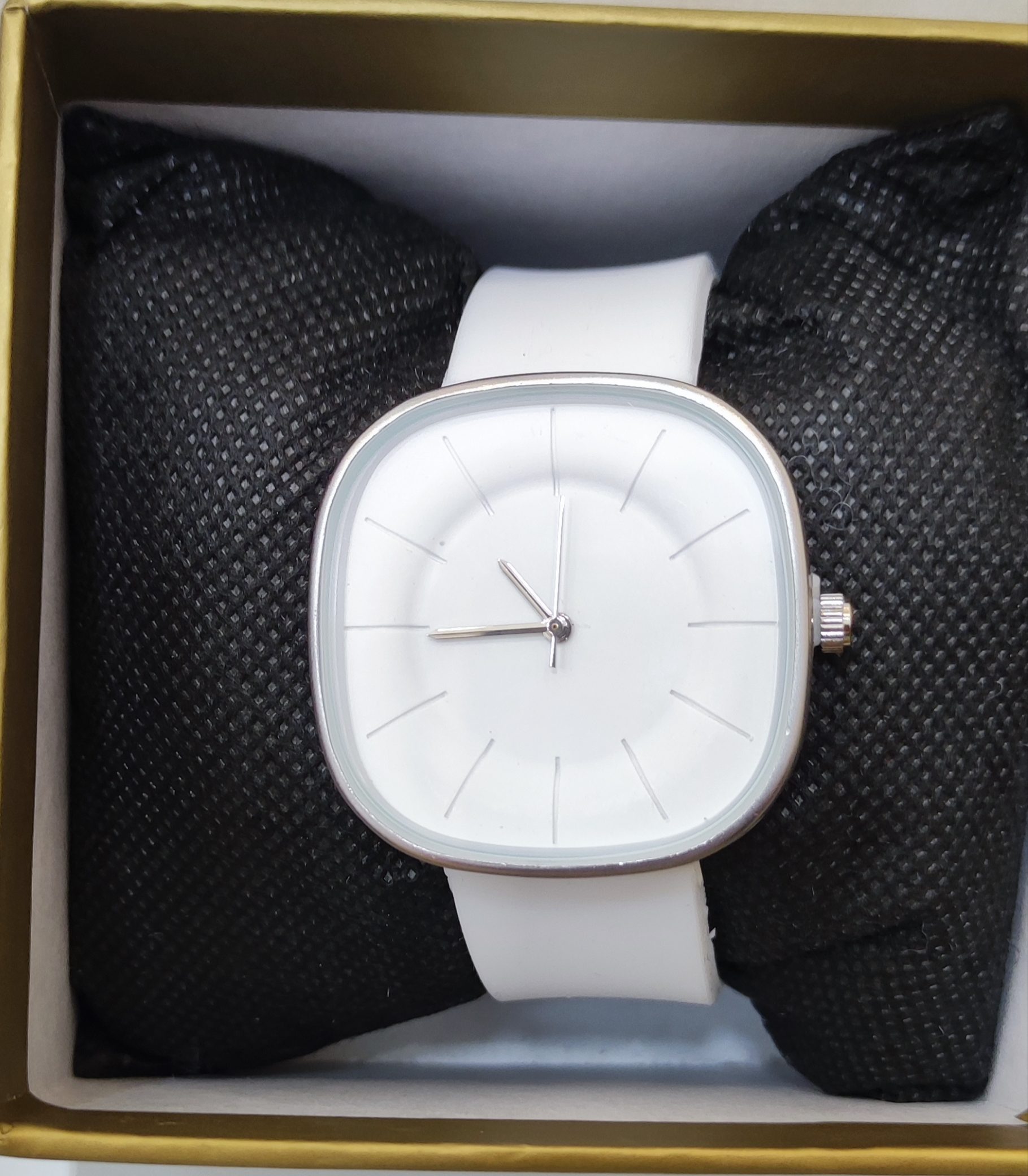 رنگ بند و رنگ صفحه ساعت سفیدرنگ می باشد و جنس صفحه استیل ضدزنگ مقاوم و بند ساعت سیلیکونی می باشد
